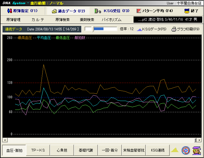 測定したデータが自動的にパソコンへ送られ、その測定データをもとに自動解析し、上記のように画面に映しだされて、末梢血管抵抗、心拍出量の増大・減少などの指標を得ることができます。