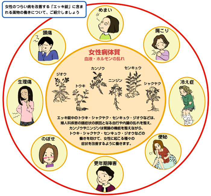 エッキ錠は、更年期障害、生理不順、生理痛といった女性に起こる種々の苦情を改善するために考え出された生薬製剤です。