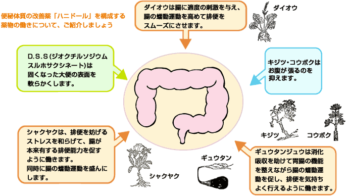ハニドールは生薬の働きを活かして腸の排便能力を促し、便秘を改善することができるように考えられた生薬配合の便秘薬です。