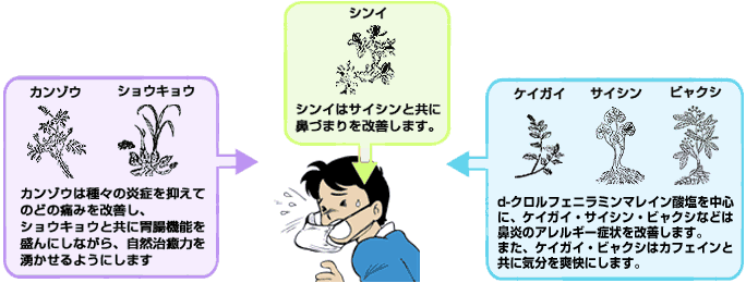 急性鼻炎、アレルギー性鼻炎又は副鼻腔炎による次の諸症状の緩和:くしゃみ、鼻みず(鼻汁過多)、鼻づまり、なみだ目、のどの痛み、頭重(頭が重い)