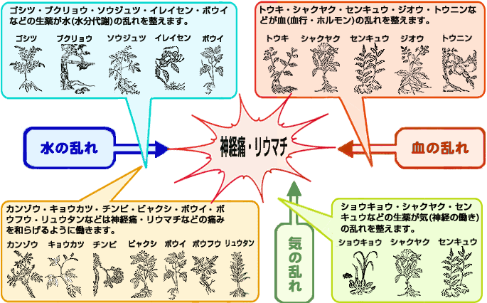 ○ 神経痛・リウマチなどの痛みのある病気は、漢方の考え方の中に気(神経の働き)・血(血行・ホルモンの働き)・水(水分代謝の働き)の乱れによって起こるというものがあります。