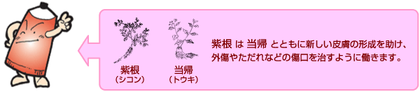 くさ*、急性・慢性湿疹、おむつかぶれ、しもやけ、股ずれ、かみそり負け、火傷、凍傷、ひび、あかぎれ、外傷、あせも、ただれ、くつずれ