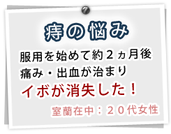 急性的な痔にはよく市販されている「軟膏剤」や「座薬」でも改善は可能なのですが、何ヶ月も、何年も長引かせた痔や脱肛などの痔は軟膏や座薬では治りきれません。 そのような方には、痔を体質・血行から改善に導く飲み薬(内服薬)をお奨めしております。