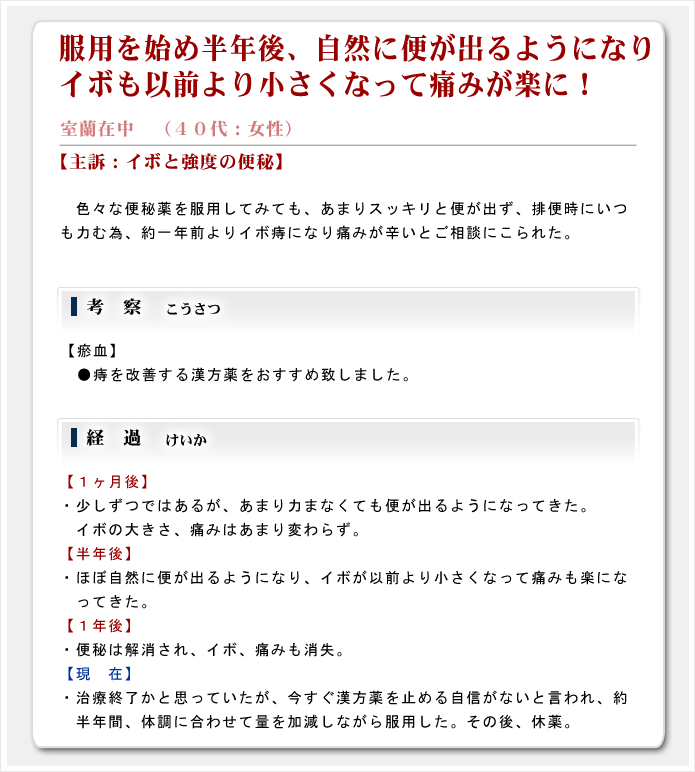 そのため「乙字湯」は江戸時代の武士(男性)を対象にした薬方であり、現代人のような体力のない人や女性の痔を考慮に入れていないのです。