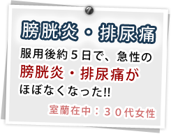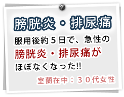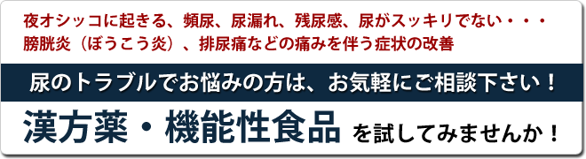 泌尿器系の炎症を鎮めながら、血行やホルモンの改善も図り、排尿痛・排尿困難などのつらい症状の回復を早めるような漢方薬を当店では取り扱っております。
