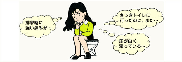 膀胱が収縮する時に炎症を起こした粘膜が刺激されるため、排尿時にさしこむような痛みが生じます。排尿の最後は特に痛みが強くなります。