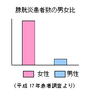 膀胱炎は「女性の5人に1人が生涯に1度は経験する」と言われる病気であり、病人の男女比を見てみますと圧倒的に女性が多いという特徴があります。 これには男性と女性の身体構造の違いが深く関係しています。