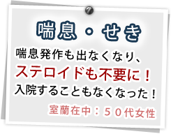 寒喘、熱喘、痰喘、気虚喘、陰虚喘、陽虚喘に分けて弁証論治を行います。