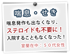 ・タバコの煙や冷たい風などは、刺激になってせきを誘発させることがあり、とくにタバコの煙は、気道の炎症を悪化させると言われています。本人だけではなく、家族も禁煙することが大切です。