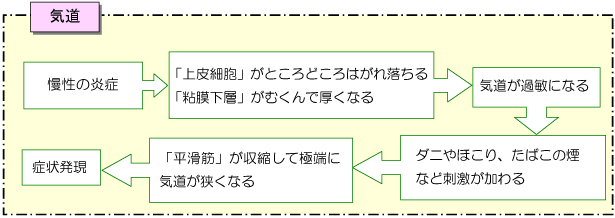 ▲.この状態を繰り返すと、炎症が悪化して気道がますます過敏になり、悪循環を招きます。