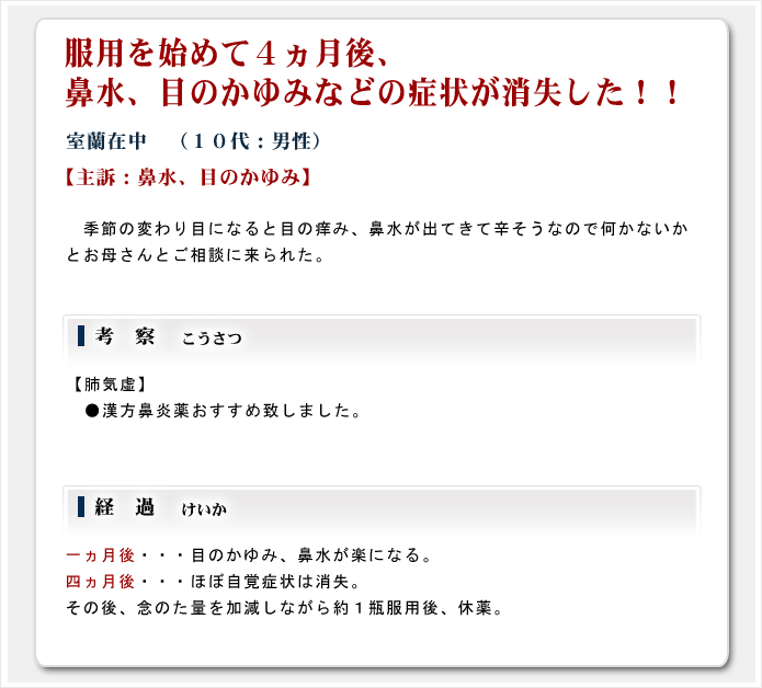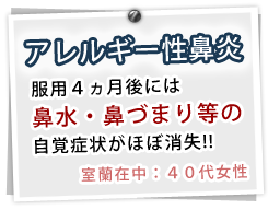 漢方治療では、アレルギー体質そのものを改善したり、免疫力を向上させたりすることによって、アレルギー性鼻炎を改善することができます。