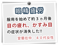 近年ではパソコンや携帯電話の普及で眼精疲労を感じる方が増えています。 また老化や衰えなどにより霞んだりボヤけたりと症状は様々です。