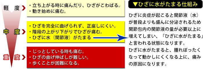 その結果、骨と骨とが直接ぶつかったり、削られた軟骨のかけらがひざ関節を包んでいる「関節包」という袋を刺激したりして、炎症を引き起こしてしまいます。