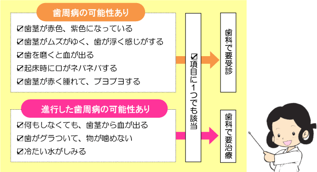 できるだけ早く歯周病に気付くために、次の項目に当てはまるかをチェックしてみましょう。