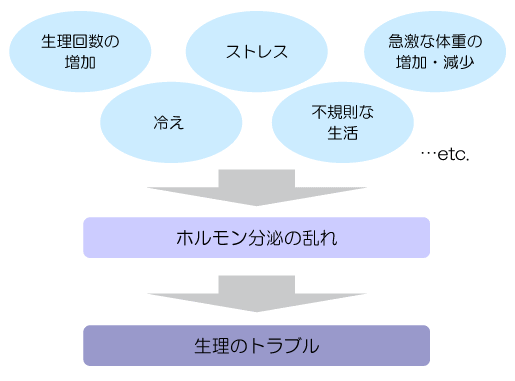 この女性ホルモンの分泌が乱れると、生理不順や生理痛などの生理のトラブルが起こってきます。女性ホルモンの分泌を乱す要因としては、「生理回数の増加」「ストレス」「急激な体重の増減」「冷え」「食事や睡眠などの生活の乱れ」などがあります。